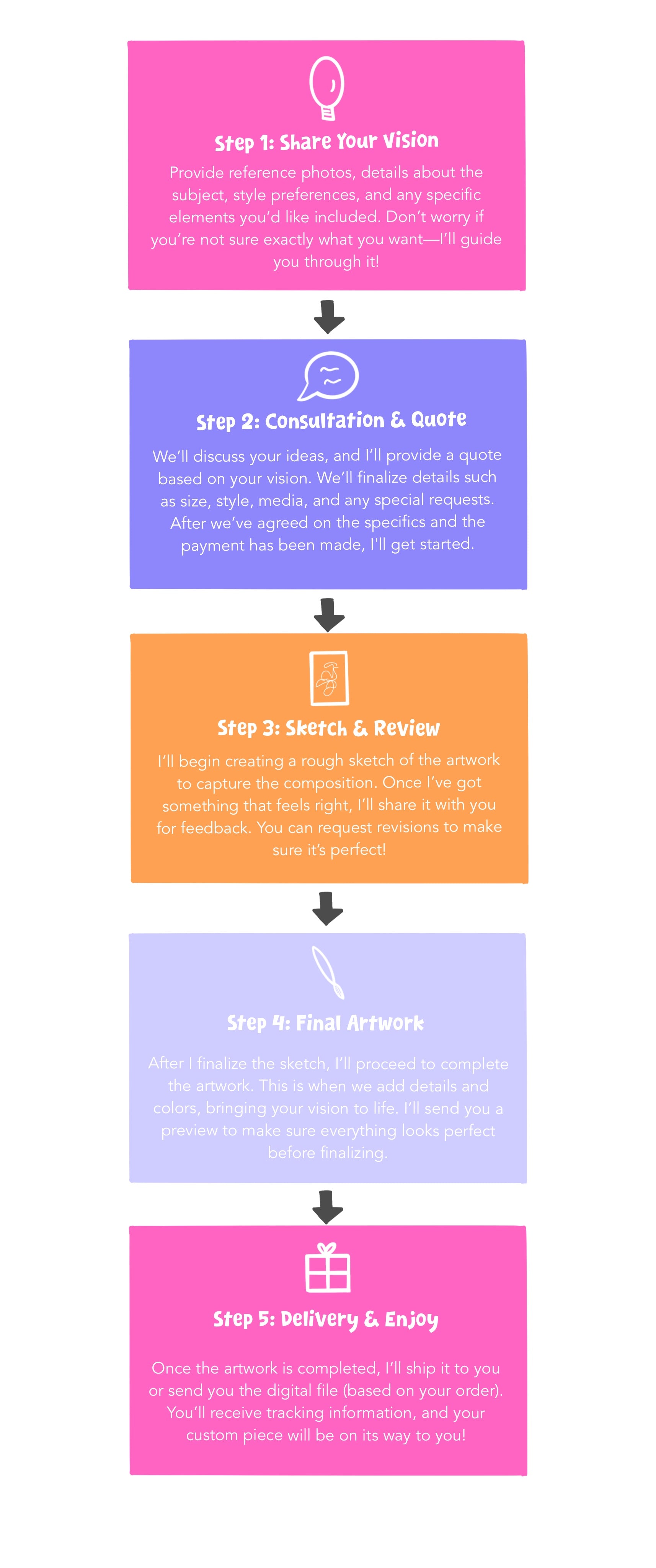 Looking for something truly unique? I specialize in creating personalized artwork that reflects your personality, memories, and special moments. Whether you're looking for a family portrait, a tribute to a beloved pet, or a one-of-a-kind piece for an event or gift, I’m here to turn your ideas into a beautiful, lasting creation. Let's work together to craft something extraordinary that you'll cherish forever!